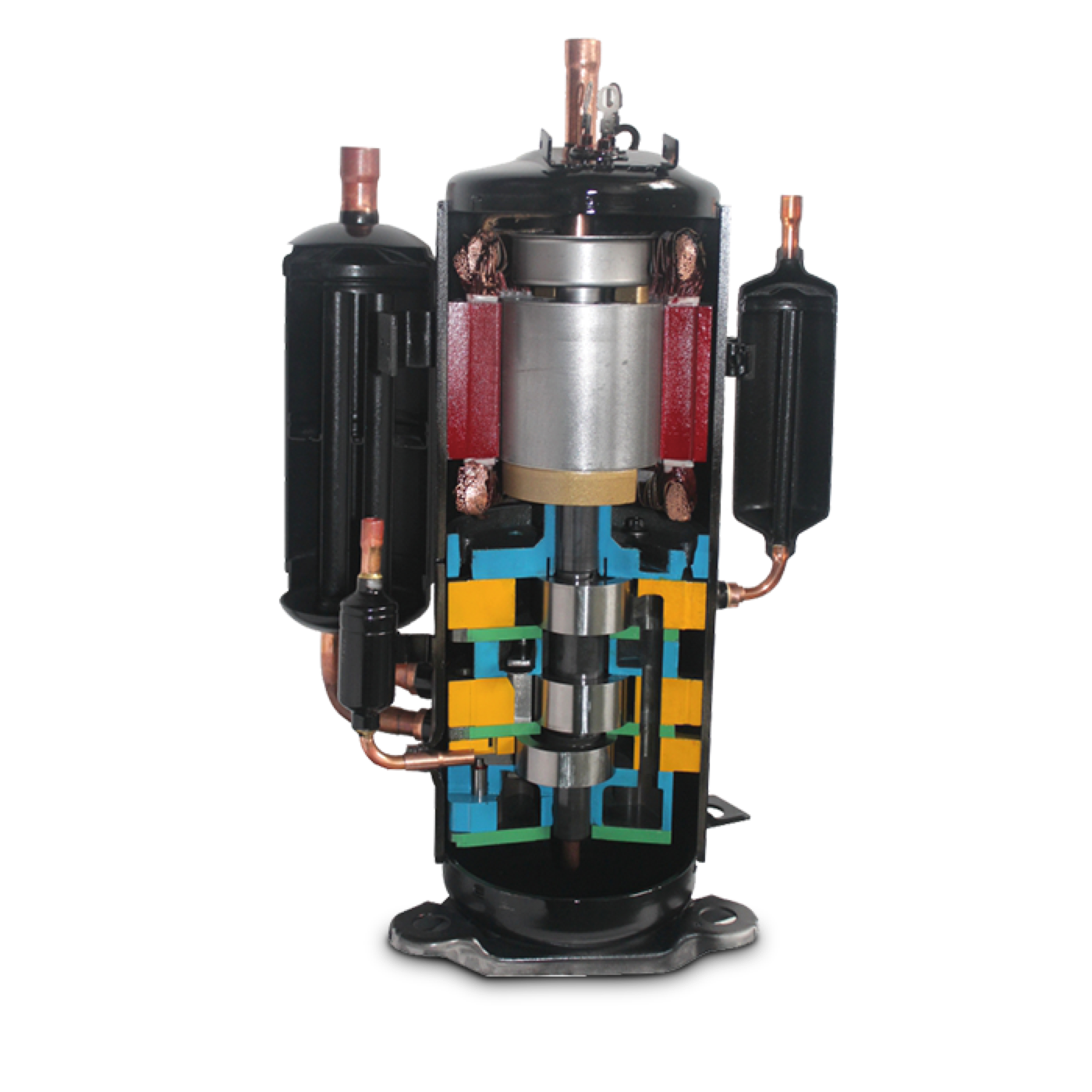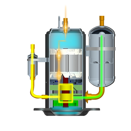 三缸雙級(jí)變?nèi)莘e比壓縮機(jī)可實(shí)現(xiàn)兩種不同容積比的雙級(jí)壓縮,可降低單個(gè)氣缸的壓縮比,減小了泄漏量,提高了壓縮機(jī)的容積效率,與單級(jí)壓縮系統(tǒng)相比,雙級(jí)增焓壓縮系統(tǒng)具有能力高、能效高和可靠性高的優(yōu)勢(shì),使用在家用熱泵空調(diào)、多聯(lián)式熱泵空調(diào)、戶用冷水熱泵機(jī)組等多種類型的熱泵產(chǎn)品中。