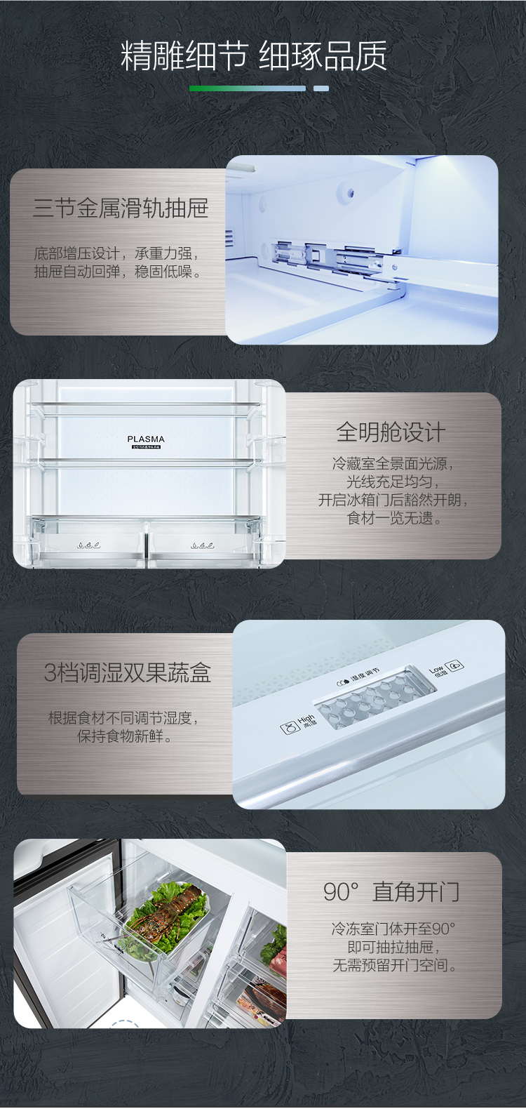 搭載-5℃嫩凍凝鮮科技,鮮嫩兩星期,輕松一刀切。Plasma等離子除菌凈味,除菌保鮮,長(zhǎng)久新鮮。4檔保鮮模式,多重角色時(shí)刻新鮮。